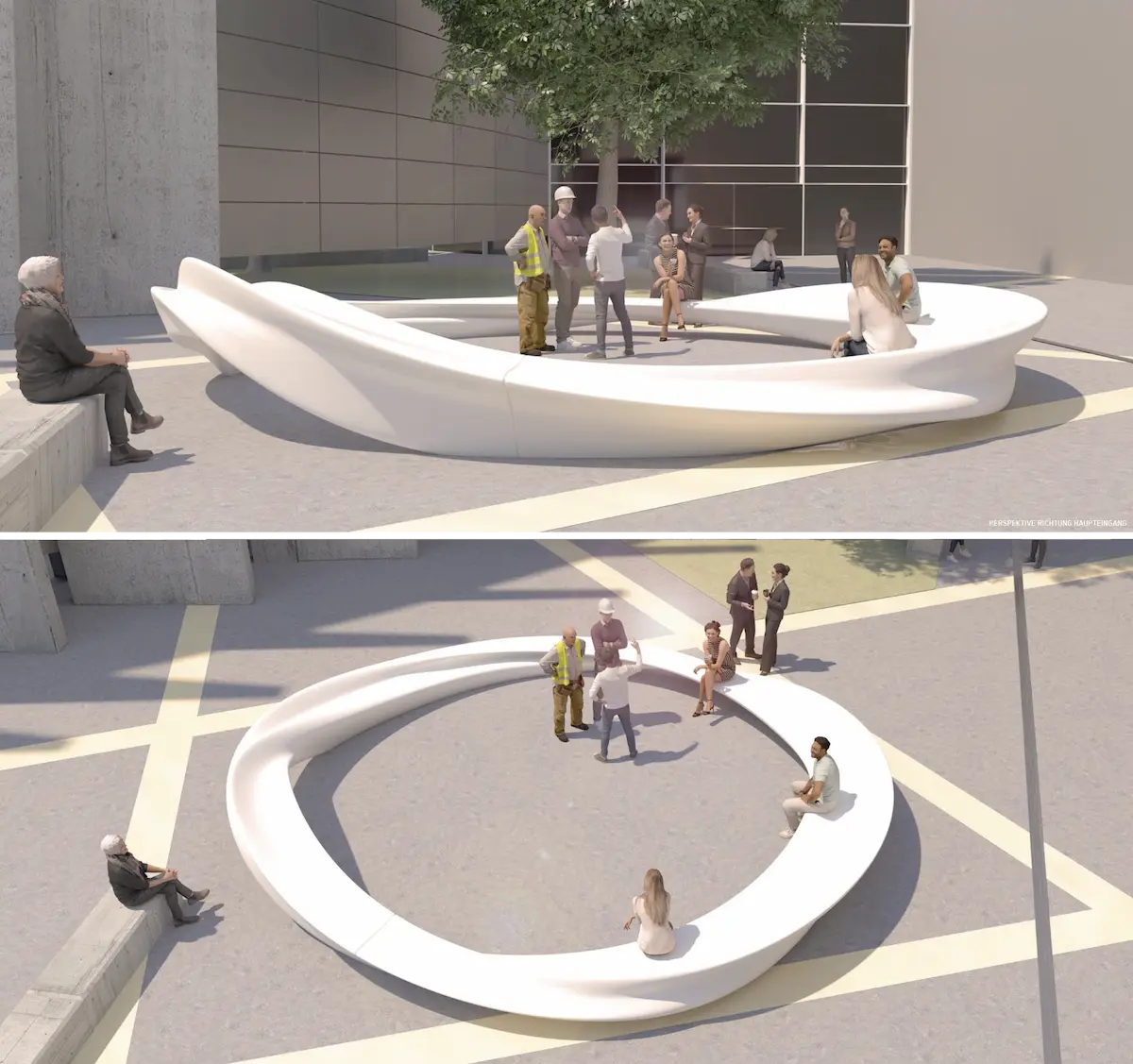 Ziel war, eine nahezu keramische Haptik, die selbst nach Regen eine angenehme Sitzfläche bietet, zu schaffen. Ein direkter 3D-Druck aus Formsand hätte zu körnige Oberflächen erzeugt. In enger Zusammenarbeit mit dem Konzeptkünstler entwickelte Dade Design einen komplexen mehrstufigen Prozess: Jedes der acht Segmente der dynamisch geformte Ringplastik wurde aus mindestens drei Einzelformen zusammengesetzt.